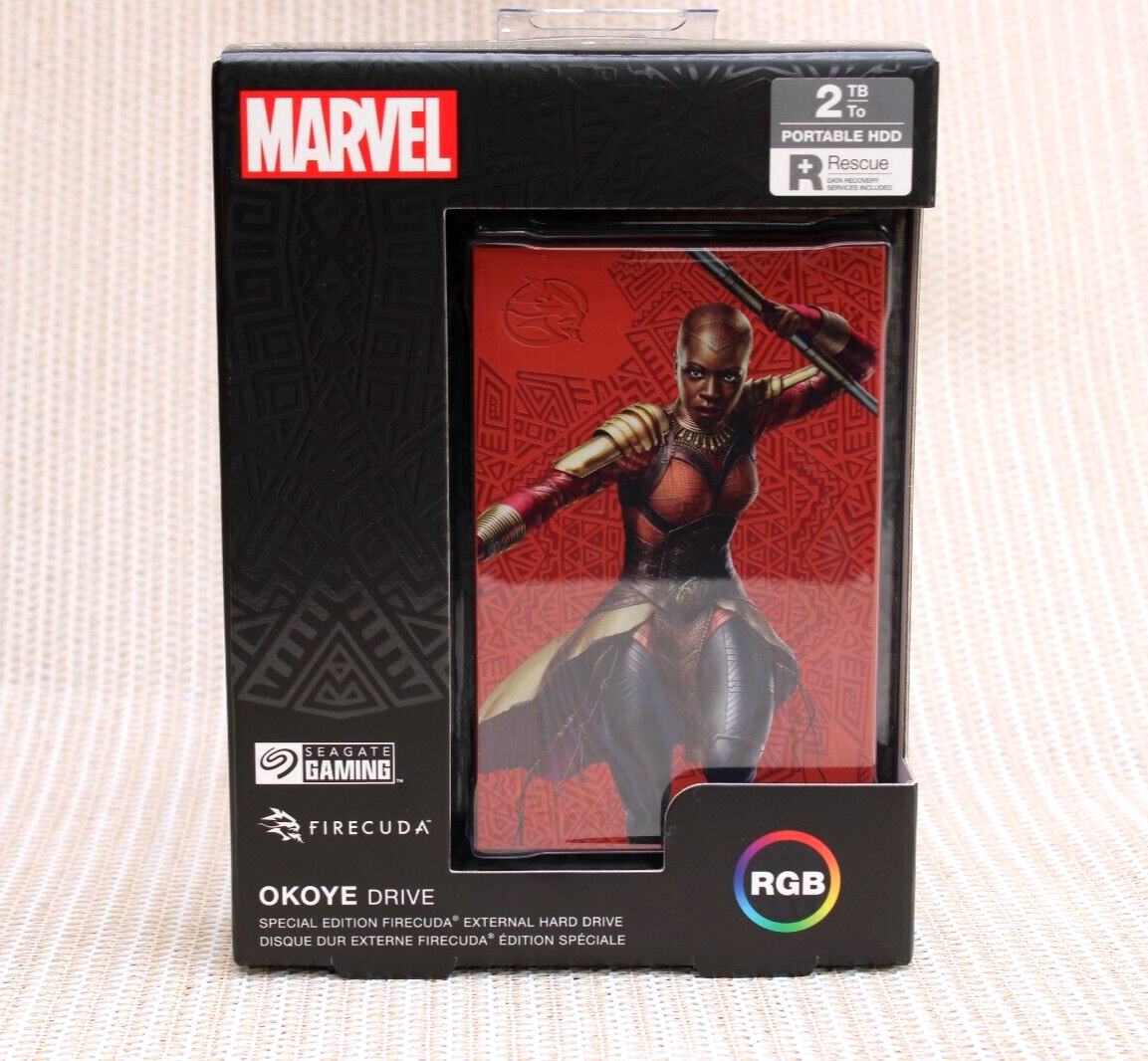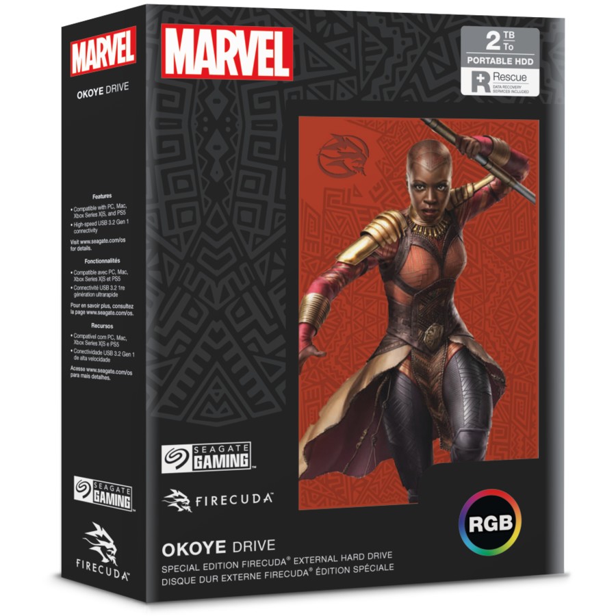 Embrace the strength and leadership of the Dora Milaje with the Seagate 2TB FireCuda External Hard Drive Okoye SE Special Edition. Designed to honor Okoye, the fearless General of Wakanda, this special edition drive features bold artwork inspired by her iconic armor and warrior spirit.