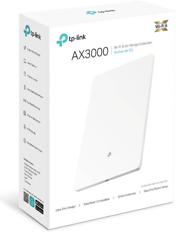 Expand your Wi-Fi coverage effortlessly with the TP-Link Range Extender Air E5. Designed to eliminate dead zones, it boosts your existing Wi-Fi signal, ensuring fast and reliable connectivity throughout your home or office. With easy setup via the TP-Link Tether app or WPS button, you can extend your network in minutes. Its compact design fits discreetly into any space, making it perfect for streaming, online gaming, and smooth browsing on multiple devices.