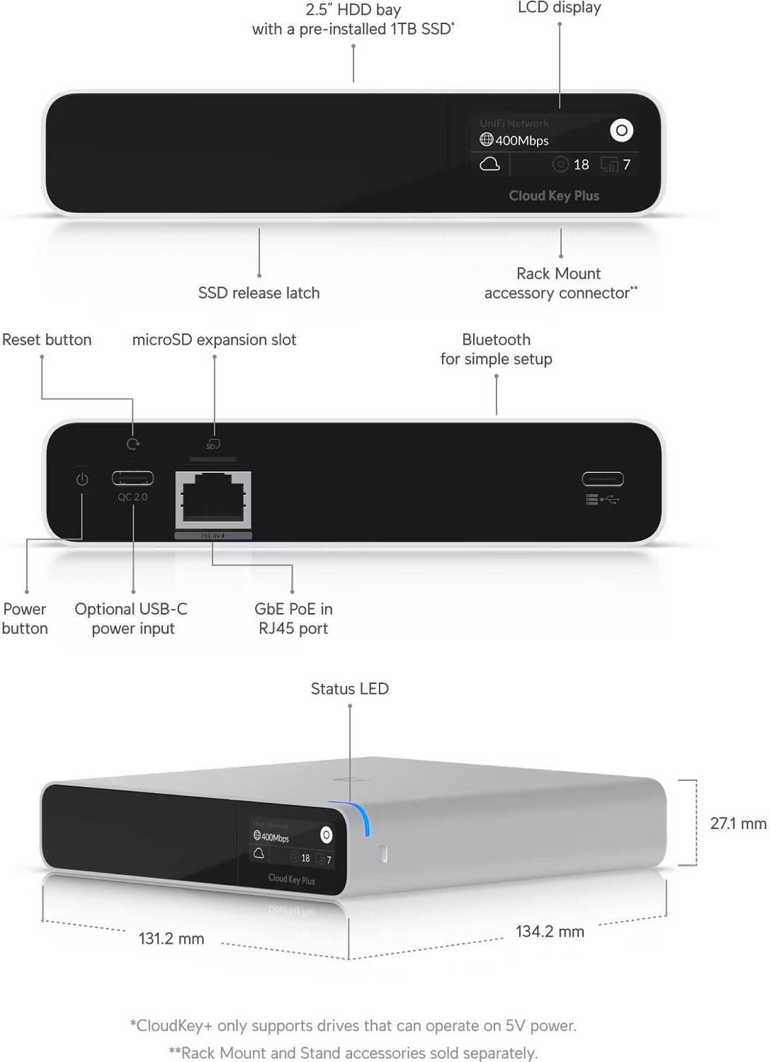 The Ubiquiti UniFi Cloud Key Gen2 Plus with SSD is an advanced hybrid cloud device designed for secure and centralized management of UniFi networks and UniFi Protect video surveillance systems. Equipped with a pre-installed high-capacity SSD, it provides reliable local storage for video recordings while offering remote cloud access for convenience.